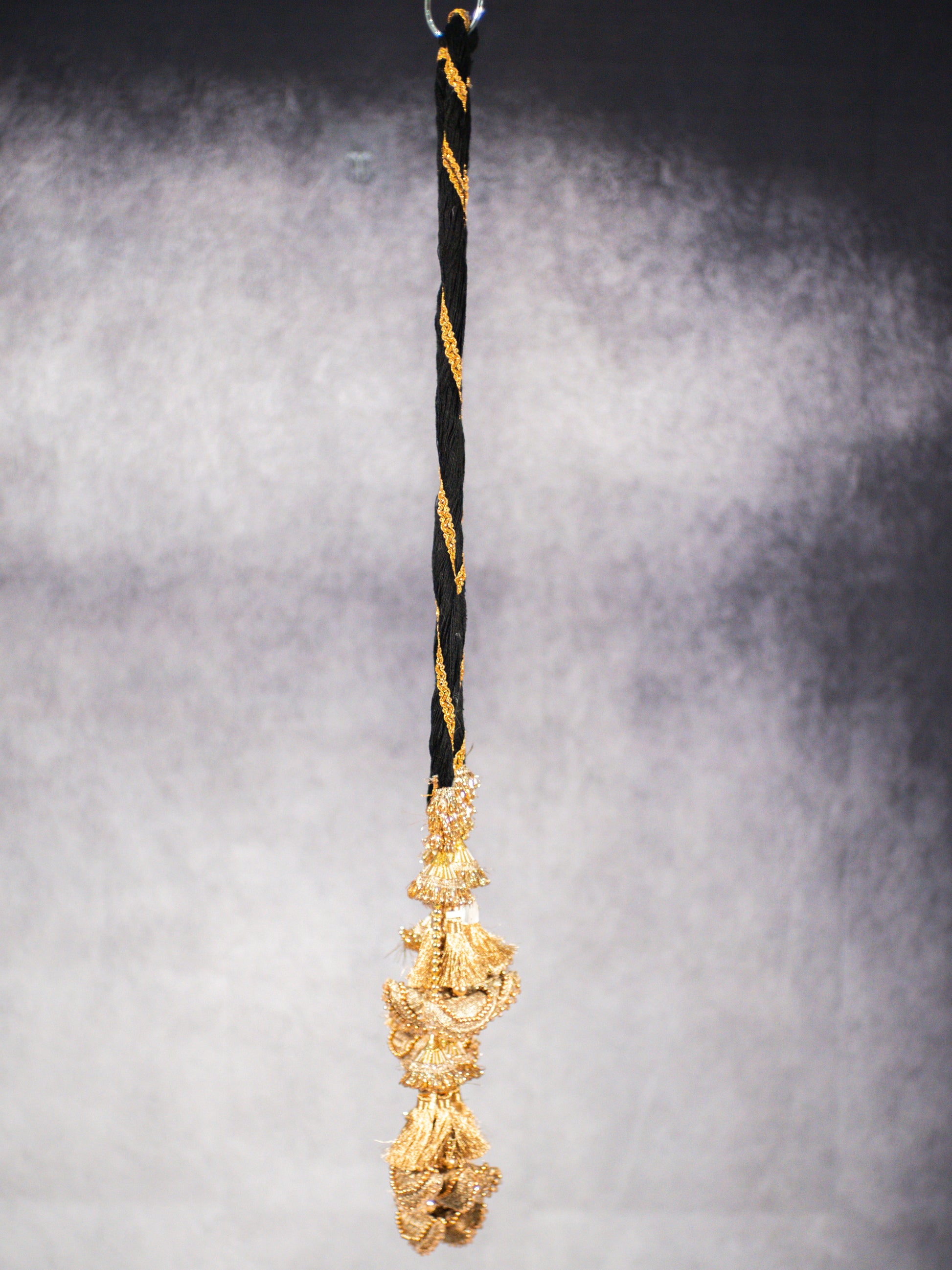 This traditional Punjabi parandi features a sleek black braided base finished with layered gold jhallar, delicate bead detailing, and soft tassels that add movement and shine. The antique gold finish gives a rich, real-gold look while keeping the design lightweight and comfortable to wear.