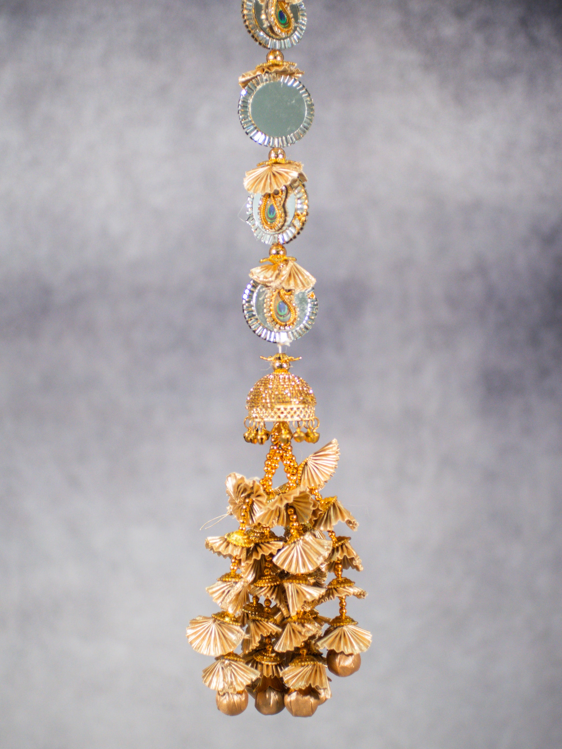 A statement Punjabi parandi crafted with antique gold detailing and reflective mirror elements that catch the light beautifully with every movement. Designed with layered gold fan motifs, dangling ghungroo-style drops, and intricate beadwork, this piece adds instant drama to braids and hairstyles.