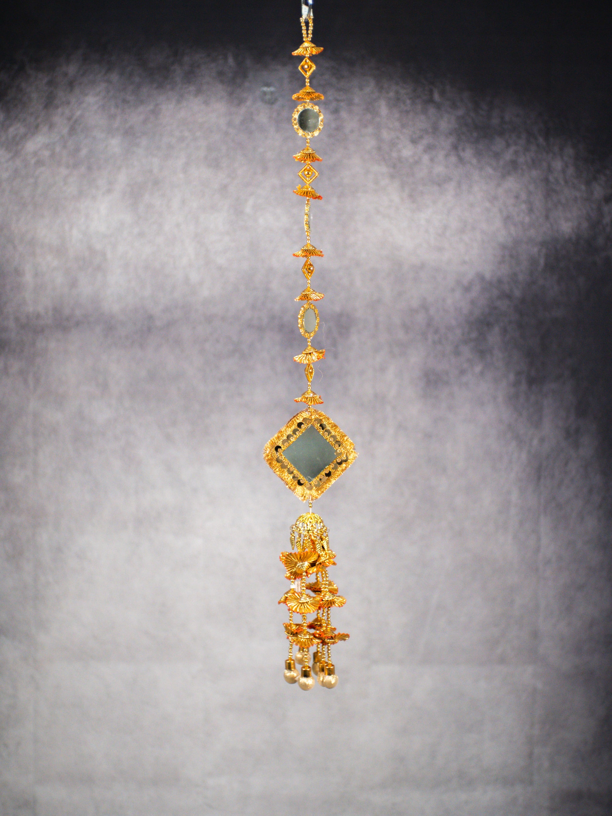 A traditional Punjabi parandi featuring a central black square mirror framed in gold detailing, finished with layered gold fan drops and pearl bead hangings. The upper length is accented with small mirror elements and gold motifs, creating a balanced, elegant flow from braid to tassel.