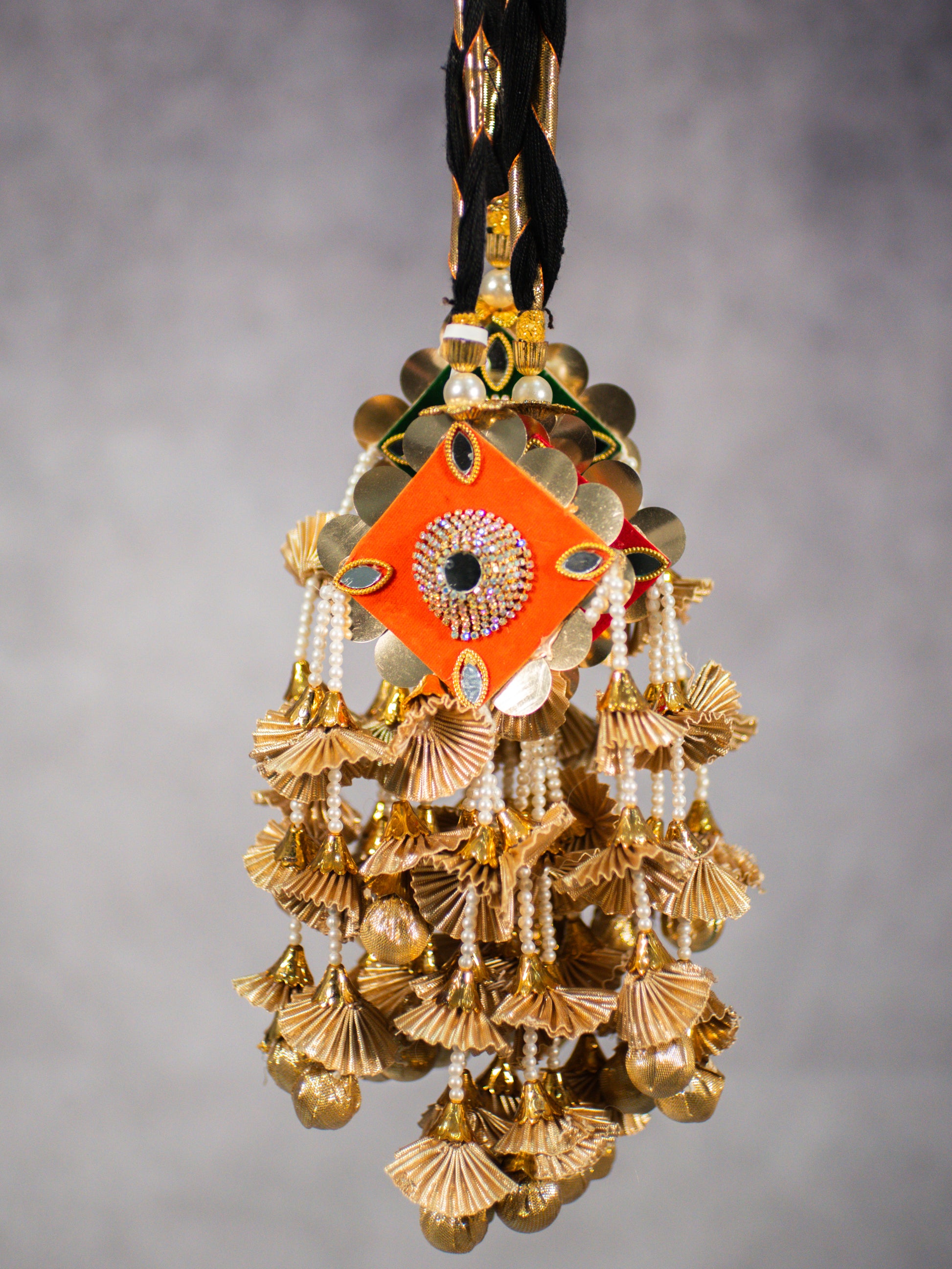 This Punjabi parandi features a classic black braided base finished with layered antique-gold jhallar, pearl strands, and a vibrant multicolour centre accent. The design is rich in texture, movement, and traditional detailing, giving a bold real-gold look without the weight.
