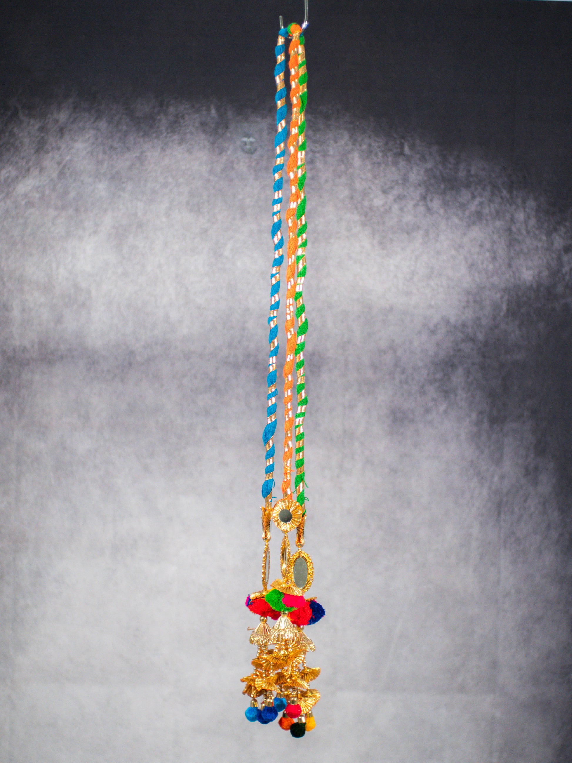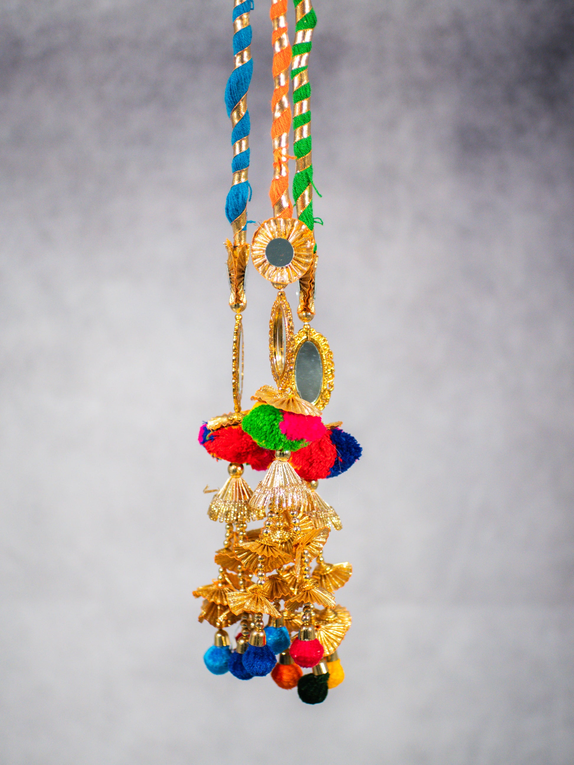 A lively Punjabi parandi crafted with twisted multicolour threads in blue, orange, and green, finished with gold mirror discs, layered golden fan charms, and bold wool pom-poms. Designed to add colour, movement, and fun to your braid.